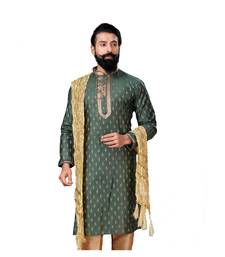 Men green dupion silk woven zari buta designer kurta
