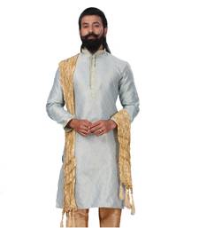Men jacquard silk woven sky blue embellished kurta