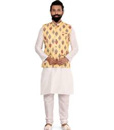 | Product Name | Men Yellow Cotton Printed Nehru Jacket With Plain White Dupion Silk Kurta Churidar | |