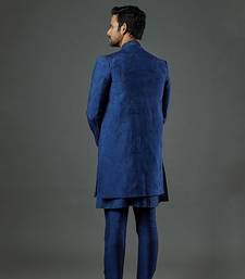 Blue front open indowestern with plain kurta and slim pants.
