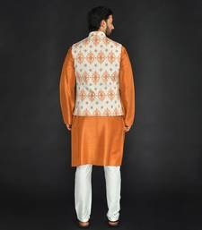 | Product Description | Off White Poly. Khadi Textured Printed Bundi With Rust Vis. Silk Kurta Paired With Off White Spun Cotton Chudidar. . |