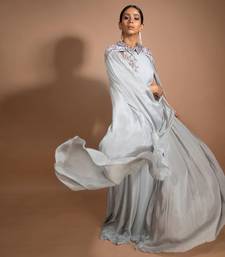 | Product Description | Featuring A Steel Grey Crystals Embellished Halter Neck Jumpsuit In Georgette. It Is Paired With Raw Silk Embroidered Cape With Attached Georgette Drape. |