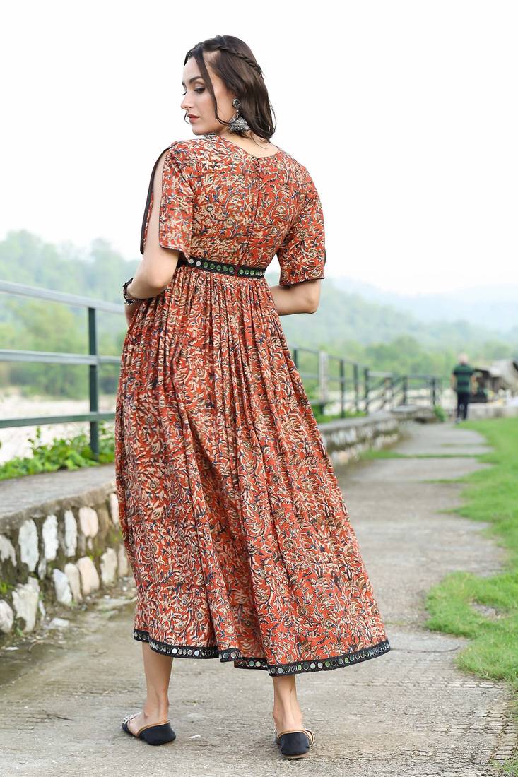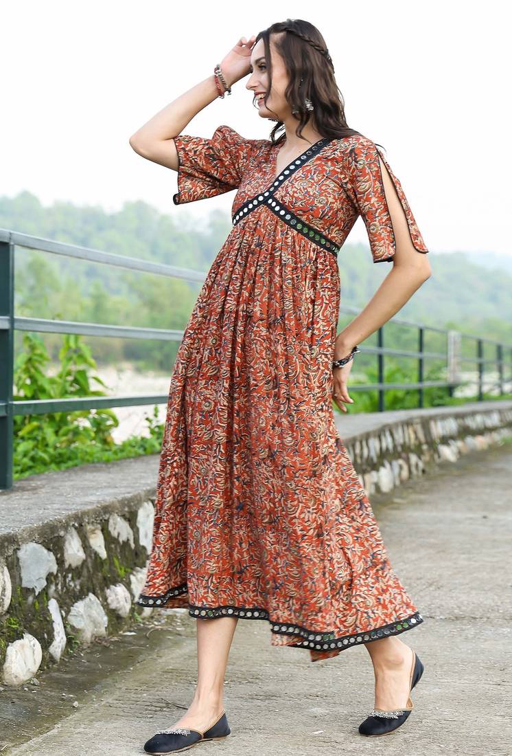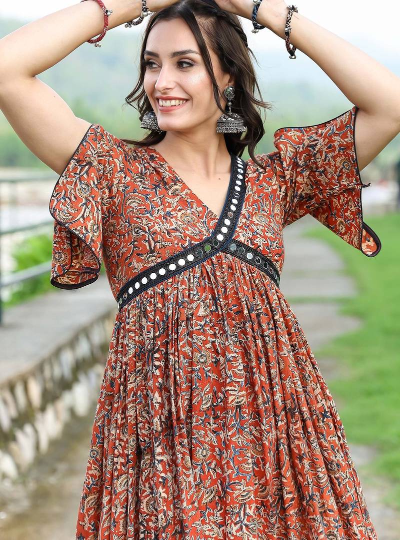 | Product Description | Empire Waist Dress In Hand Block Printed Fabric With Mirror Work In Neckline And Hem , It Has A Back Zip To Provide Fitted Look In The Bust Area. It Features A V Neck And Is Flared At Waist For Comfortable Yet A Very Stylish Look |