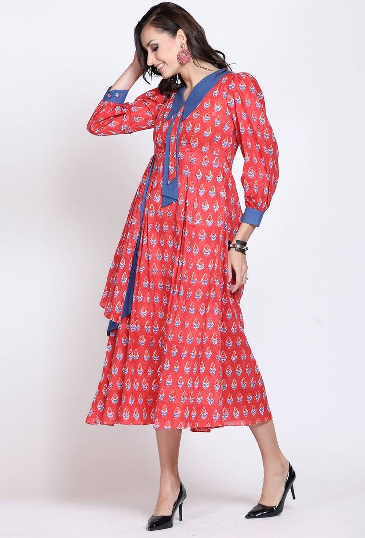 | Product Description | This Is A Chic A Line Dress That Features Exquisite Handblock Printed Floral Motifs On Breathable And Soft Cotton Fabric, A Chic Bow Neck And Cuffed Sleeves . This Flowy And Feminine Is Versatile And Can Be Styled For Numerous Occasions Be It Your Daily 9 To 5 Commute , Weekend Out , Brunch With Friends Or A Romantic Evening With Your Beloved . |