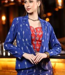 | Product Description | Ikat Cobalt Blue Flared Pants And Jacket With Corset Top Is Made Of Handcrafted Cotton Ikat Fabric That Is Soft And Breathable Features A Corset Style Bustier Handblock Printed Top With Adjustable Drawstring And Lining For A Desirable Fit ,Embellished With Faux Pearl Buttons, It Is Paired With Stylish Bell Bottom Ikat Pants That Are Fitted At Waisline , This Co Ord Set Also Includes A Stunning Cotton Ikat Jacket With Mulmul Lining That Adds Versatility To This Co Ord Set , Pair Up With Jacket For Your Day Full Of Meeting And Coffee And Dress Down For An Evening Of Fun, Frolic And Partying . |