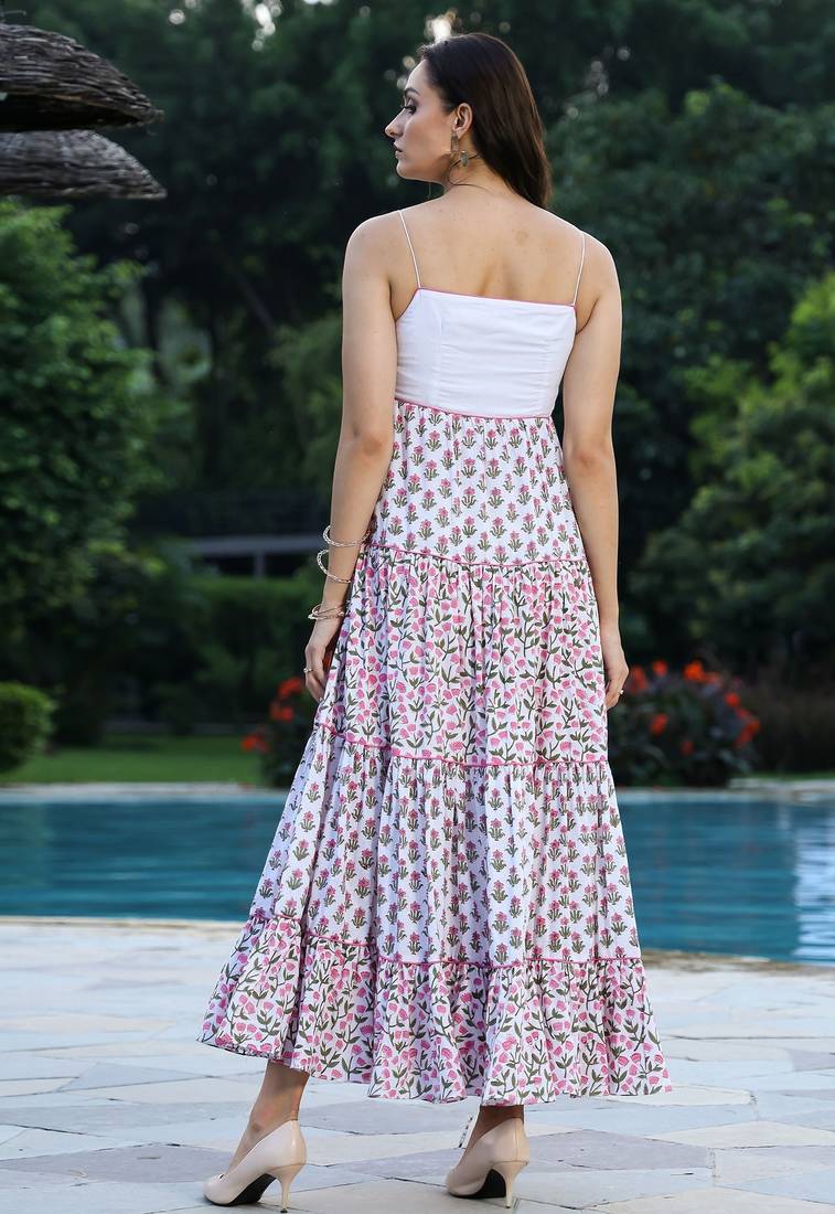 | Product Description | A Cotton Handblock Printed Floral Dress With Tiered Silhouette , Maxi Length And Noodle Straps , Paired With A Ruffled Detachable Floral Shrug.This Dress Features A Flare Perfect For Clicking Some Twirling Snaps . |