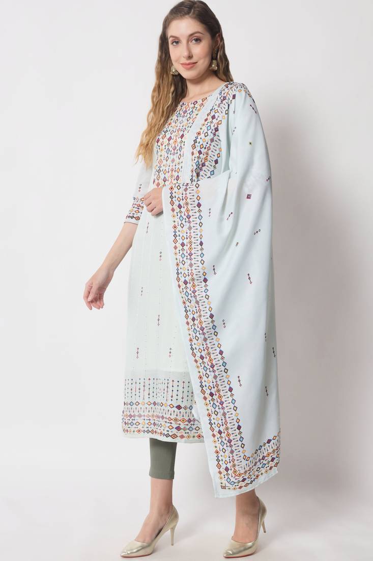 Tea green embellished silk blend women's kurta, pyjama & dupatta set stitched