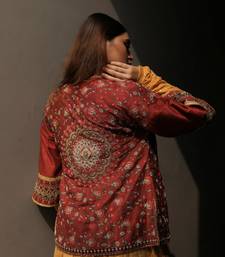 | Product Description | Yellow A Line Kurta With Churri Sleeves And Delicate Pearl Embroidery. Rust Boxy Jacket With Kimono Sleeves And All Over Jaal Threadwork Embroidery. Paired With Yellow Churridar. |