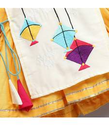 | Product Description | Yellow Cotton Silk Kurta Frock Set With Kite Embroidered Palla Over Centre Of The Kurta. Drawstrings On The Sides With Colorful Tassels Pyjama With Elasticated Waist.