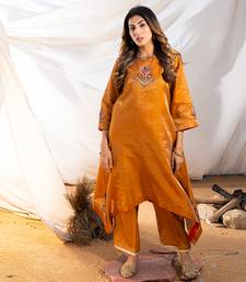 | Product Description | Rust Handloom Cotton Zari Tissue Embroidered Kurta Set. Embroidered Motifs Grace The Corners Of The Asymmetrical Hemline, Each Stitch Meticulously Crafted With Gold Zari And Silk Threads.Paired Seamlessly With Glazed Cotton Pants Featuring A Gold Embroidered Border.
