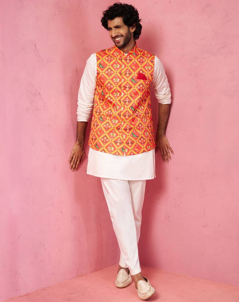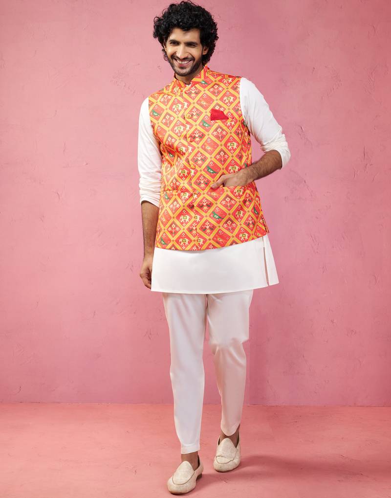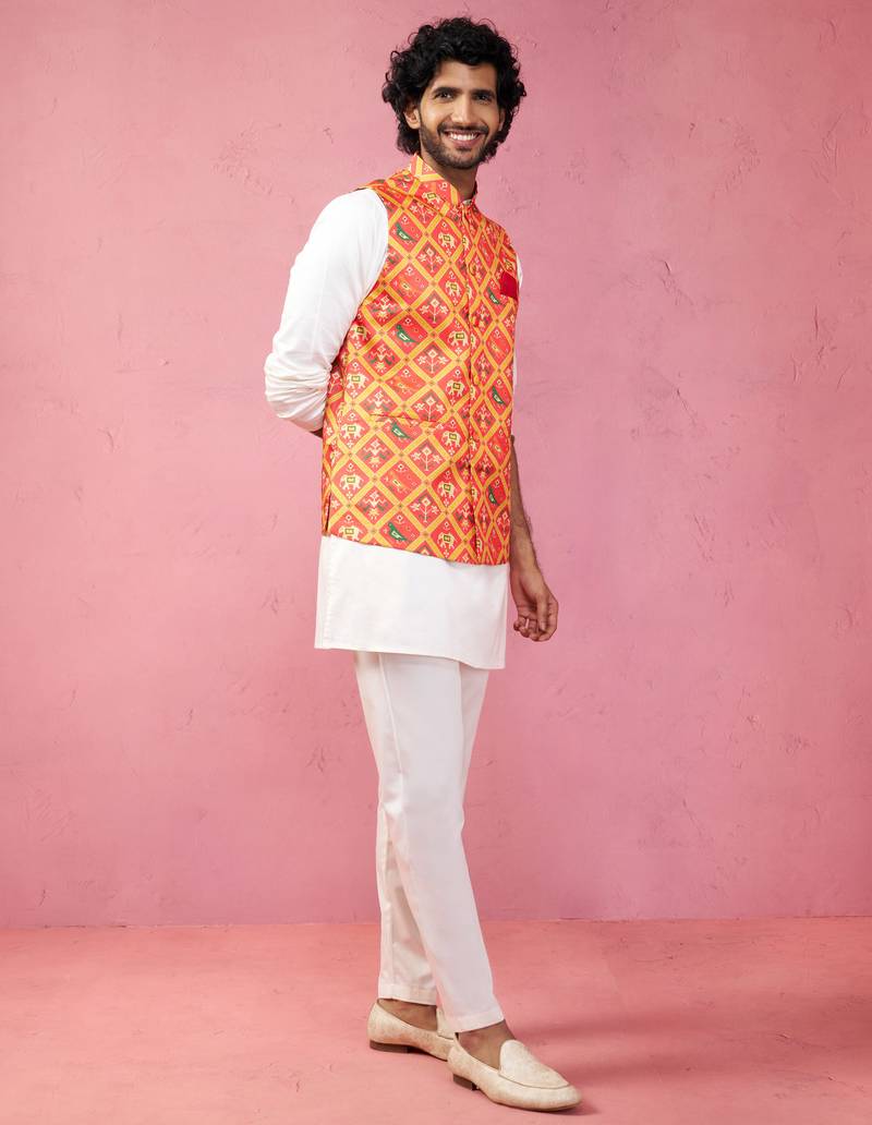 | Product Name | Men's Orange Patola Print Nehru Jacket With Cream Kurta Pyjama Festive Set | |