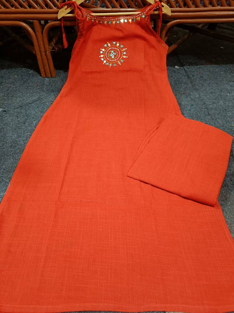 | Product Description | This Rust Orange Cotton Kurta Set Features Elegant Sleeveless Styling With Delicate Thread And Mirror Embroidery At The Neckline. Designed For Both Comfort And Grace, It Comes With Matching Straight Pants — Perfect For Festive Gatherings, Casual Outings, And Semi Formal Occasions. Fabric: Pure Cotton; Soft, Breathable & Skin Friendly Kurta Style: Sleeveless Straight Cut Kurta With Side Pockets Work Details: Mirror And Thread Embroidery On Neck Line And Front Yoke Sleeves: Sleeveless With Neat Finishing Pant Style: Straight Fit Matching Cotton Pants Occasion: Ideal For Festive Wear, Get Togethers, And Casual Functions Set Contents: 1 Kurta & 1 Pant 🟢 Note: Color May Slightly Vary Due To Lighting & Screen Resolution. |