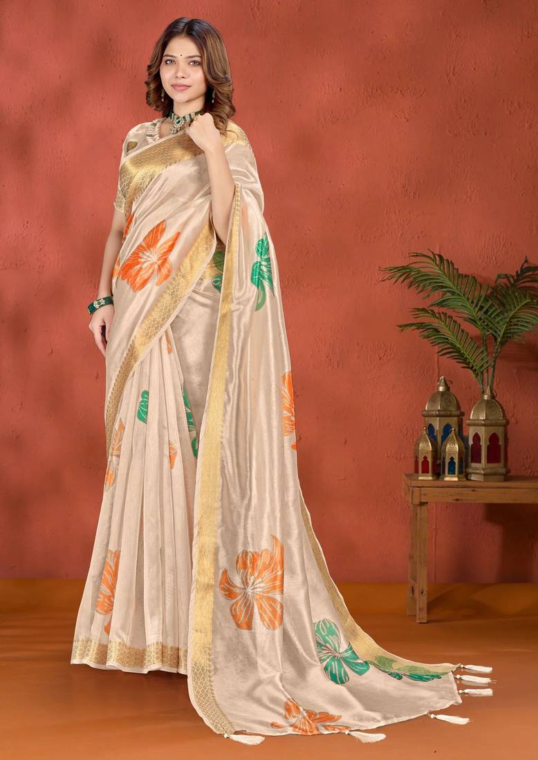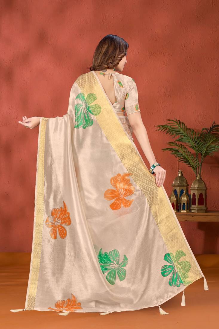 Cream printed art silk designer pallu saree