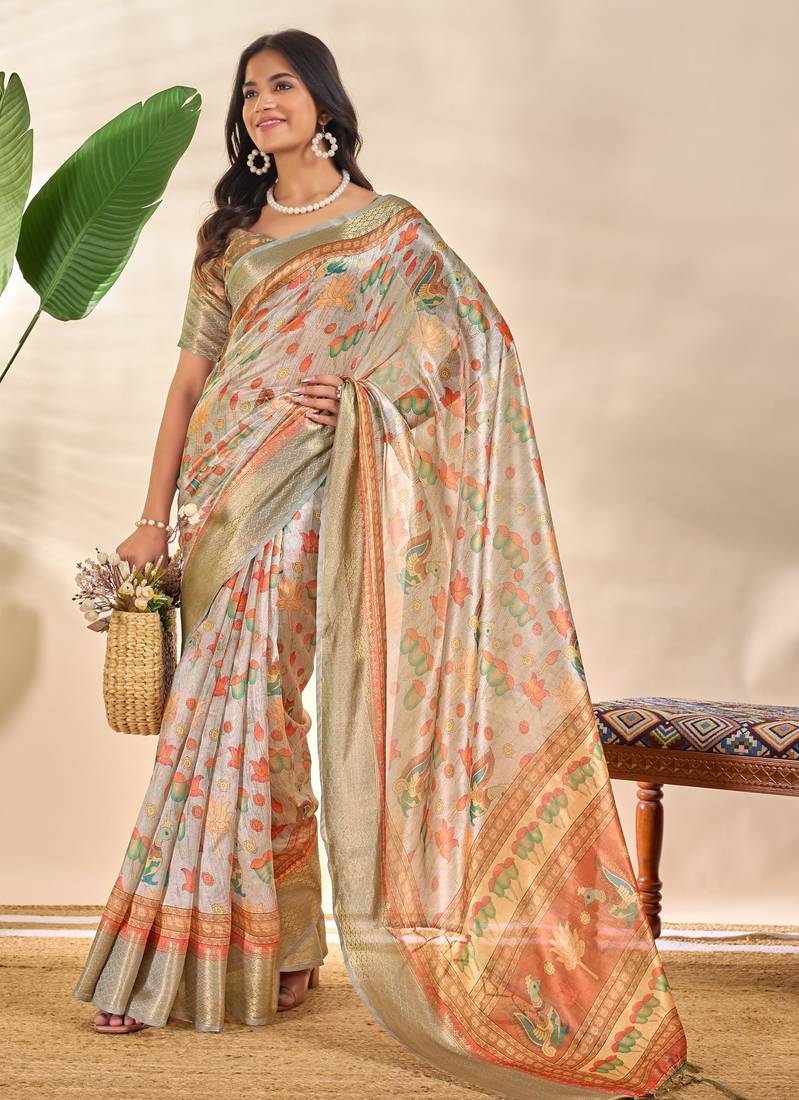 Cream printed art silk designer pallu saree