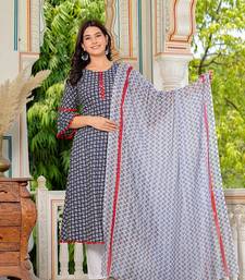 Yash gallery women's cambric cotton printed mirror work a-line kurta with dupatta set (blue)